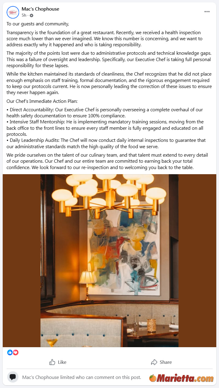 Mac’s Chophouse responded to the recent health inspection score via Facebook on Thursday, January 1, 2026 at 8:40 am: