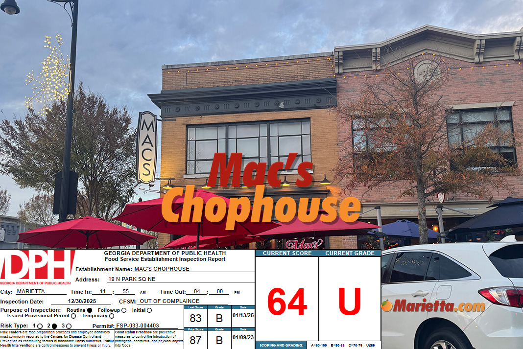 The inspection record (included below) does not list a reinspection date, though one will likely take place on or before Friday, January 9, 2026. According to the Georgia Department of Public Health, if a food service establishment is graded as a “U” and does not earn at least a grade “C” within ten days of receiving the “U”, it may be requested to voluntarily close until all violations are corrected or have its food service permit suspended or revoked.
