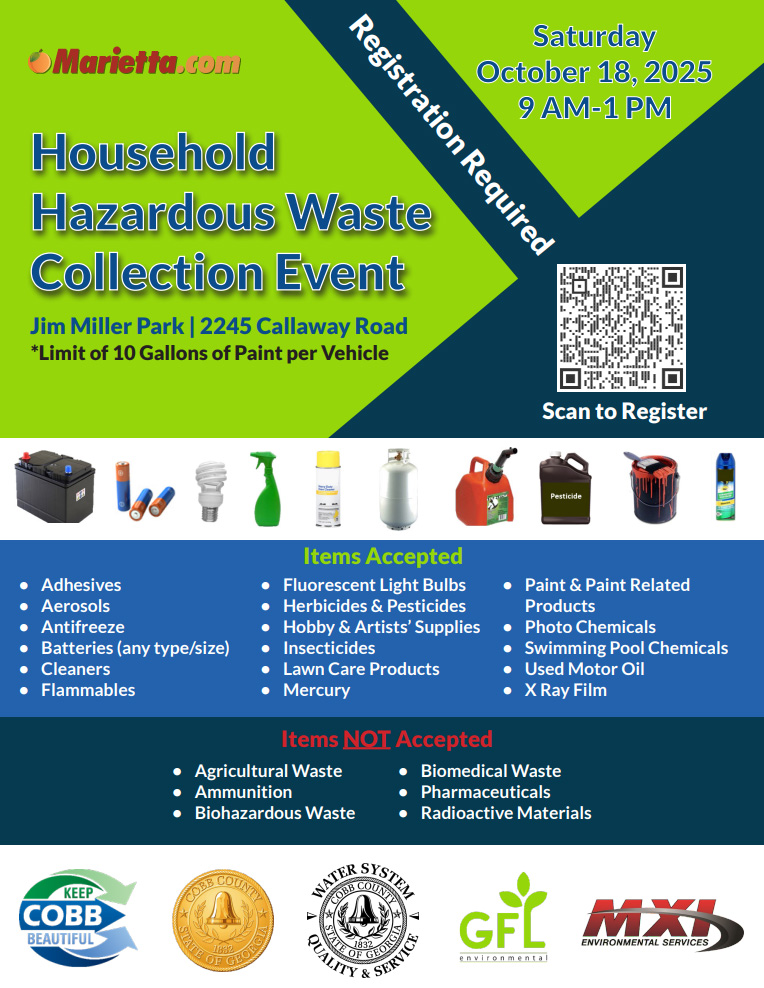 Keep Cobb Beautiful is hosting their Annual Household Hazardous Waste Event at Jim Miller Park. This is free for Cobb County residents, but no commercial vehicles are allowed. The event is available by appointment only. Residents are limited to 10 gallons of paint per vehicle.