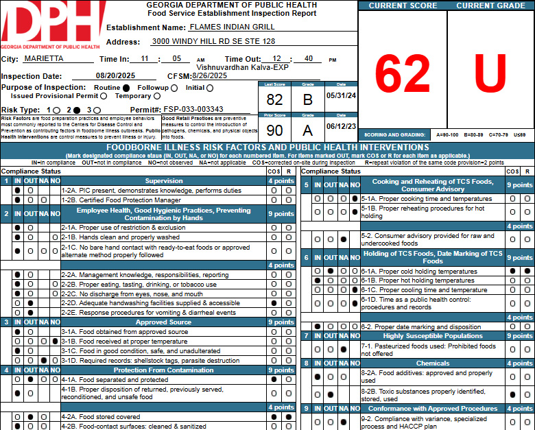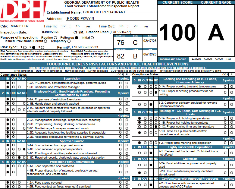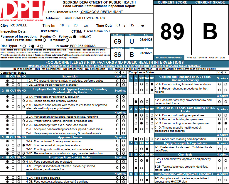 Most restaurants are inspected once or twice each year. Inspectors review food safety practices such as proper holding temperatures, employee hygiene, food storage, and cooling procedures. Full inspection reports are available through the Georgia Department of Public Health’s online portal.