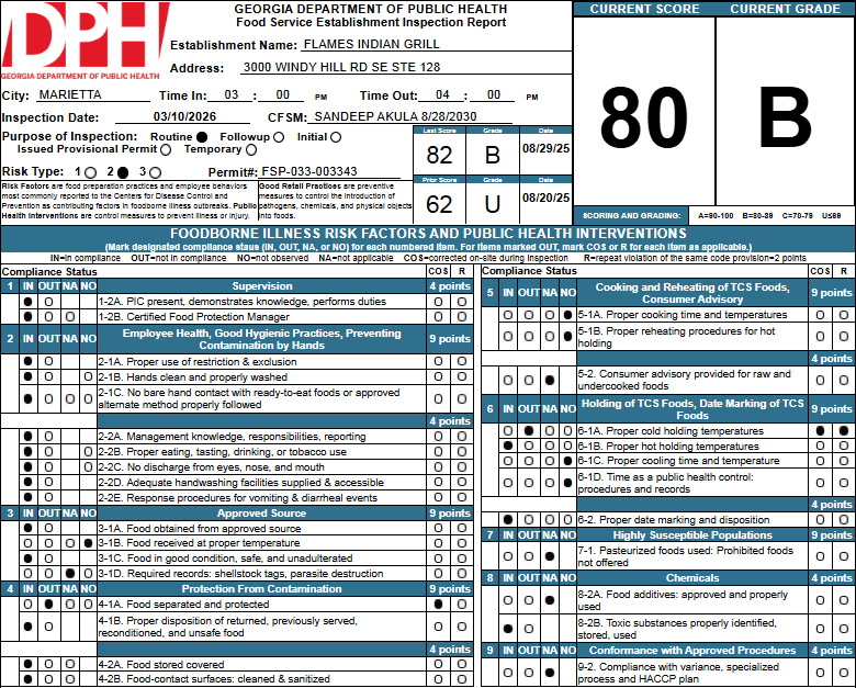 - Previous Inspection Scores for Flames Indian Grill: