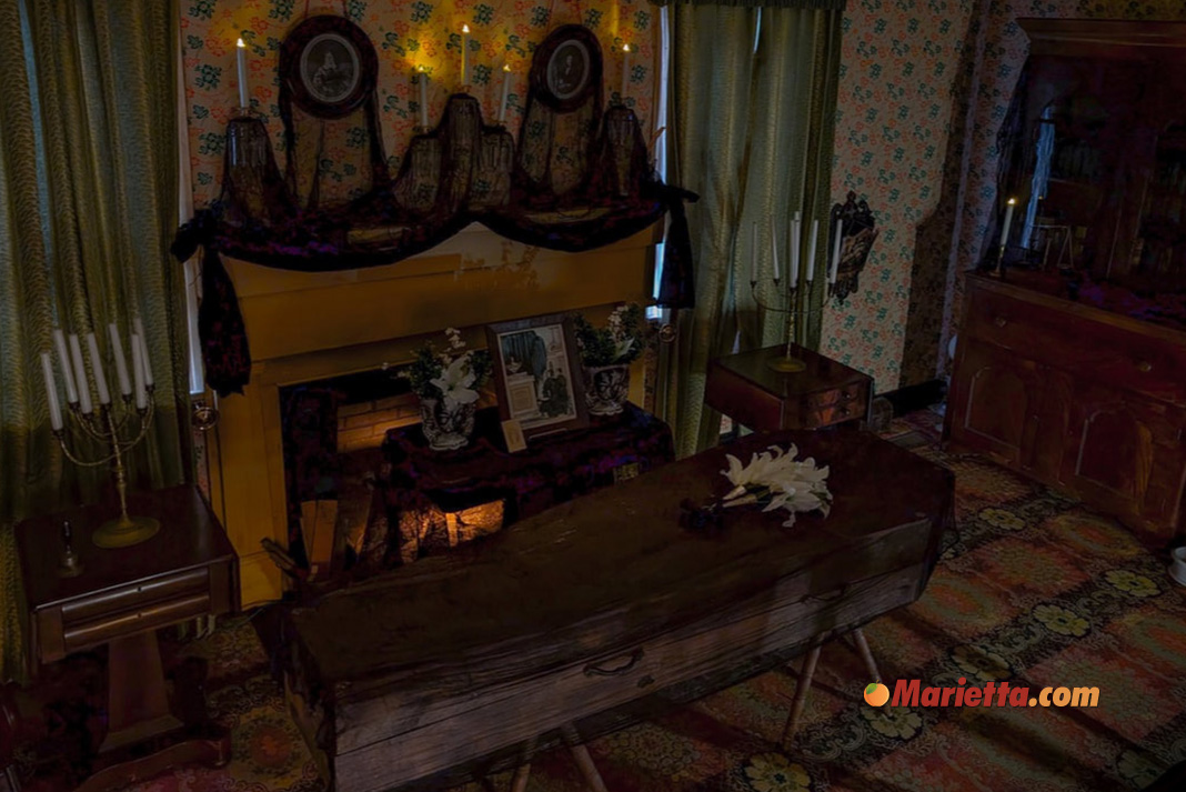 The exhibit portrays how the family would have prepared the home for mourning, with curtains drawn and rooms adorned in black crepe and ribbons. Visitors will encounter 19th-century embalming tools, mourning jewelry fashioned from human hair, and other authentic relics of the period. Daytime tours featuring the exhibit are included with regular museum admission.